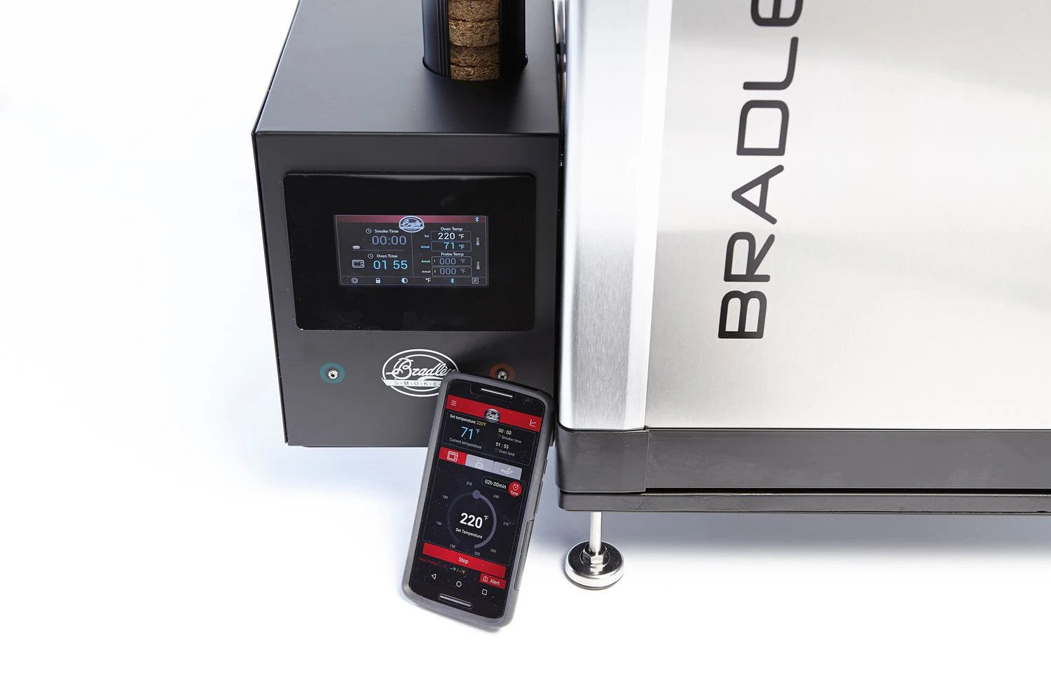 Durch den Anschluss via Bluetooth 4.0 können Sie Ihren Bradley Smart Smoker bequem mit einer Handy App steuern. Kompatibel mit jedem beliebigen iOS- und Android Gerät.