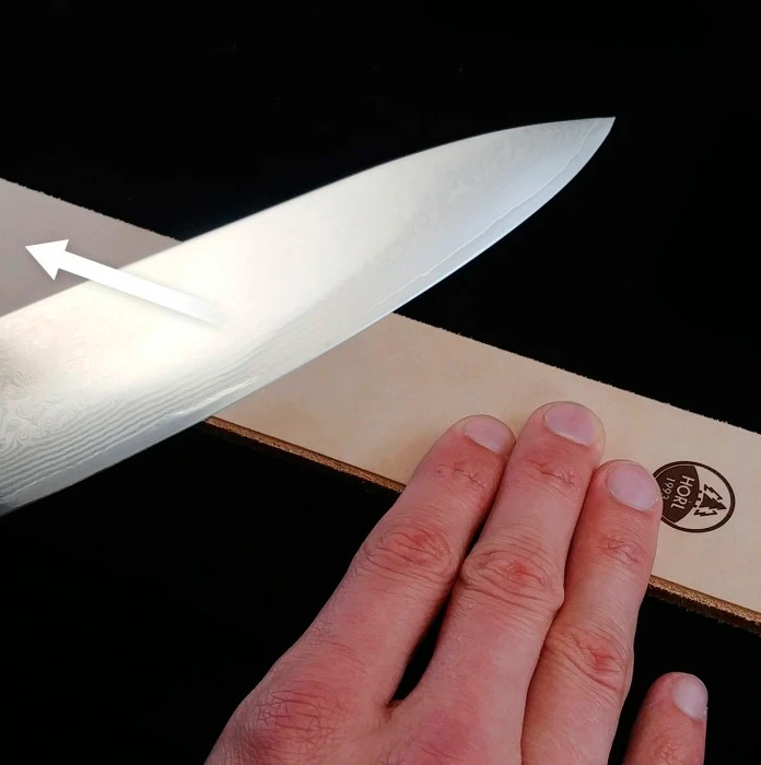 Die feinporige Oberfläche des Leders befreit die Schneide des Messers von feinsten Schleifresten, die nach dem Schleifen noch vorhanden sind.