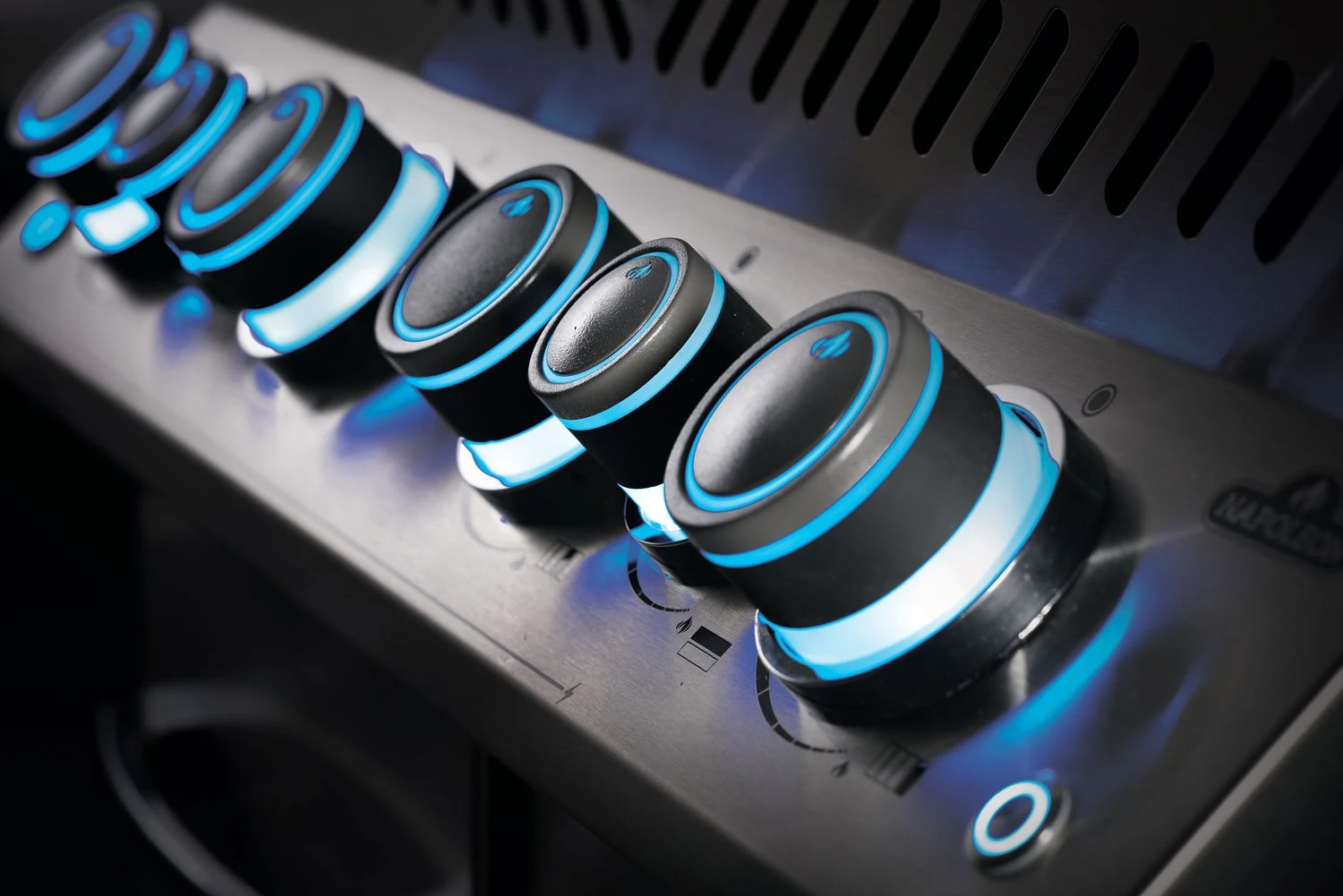 Perfekt in Szene gesetzt und noch dazu stets die Kontrolle über den Garraum – mit den speziellen SAFETY GLOW™ Drehreglern erkennen Sie auf einen Blick, ob der jeweilige Brenner bzw. die Düse offen oder geschlossen ist. Die Regler leuchten in den Farben Blau und Rot. Blau bedeutet der Brenner ist aus (bzw. kein Gasfluss vorhanden), Rot bedeutet dass die Gaszufuhr geöffnet ist. Hinweis: Überprüfen ob „rote“ Brenner gezündet sind. Die Beleuchtung zeigt nicht an, ob der Brenner tatsächlich brennt, nur ob der Gasfluss offen oder geschlossen ist.