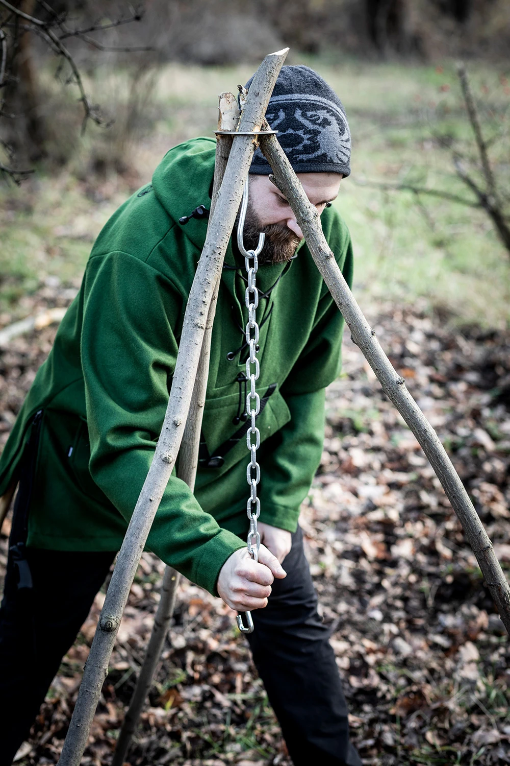 Mit den zwei Haken und der Kette lassen sich nun Feuertopf oder Teekessel über der Feuerstelle aufhängen. Die Hitze regeln Sie über die Kettenlänge.